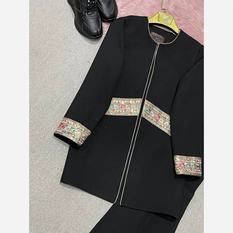B #79005 🛍نام : کت شلوارگلبهار🍂 جنس : کرپ مازراتی با خرجکار هندی👌🍂 🌈رنگ بندی : مشکی✔️ ⚜️سایز ها : 38تا43, 44تا48, 50تا52✔️ 🛍قدکت حدودا80 قدشلوار103 دمپاشلوار60 قداستین61✔️ 💫 دورسینه سایز1=100 دوربازو:38 دورران:60 ✔️ 💫دورسینه سایز2=108 دوربازو:40 دورران:63✔️ 💫دورسینه سایز3=118 دوربازو:46 دورران :66✔️ جلوی کت تماما لایی خورده✔️✔️ 🌹کار کاملا رنگش مشکی هست و اصلا بور نیست. خرجکار بسیار عالی و بدون ریزش
