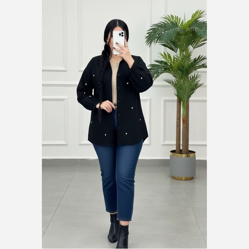 ط #89742 🍂نام : شومیز لینن قلبی 🍂جنس : لینن سنگ شور شده 🍂رنگ بندی : مشکی 🍂سایز ها : فری 38تا 48 🍂قد شومیز از جلو 70 🍂قد پشت شومیز 77 🍂قد استین از یقه 68 🍂دور سینه 120