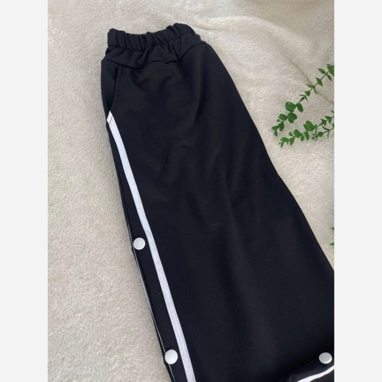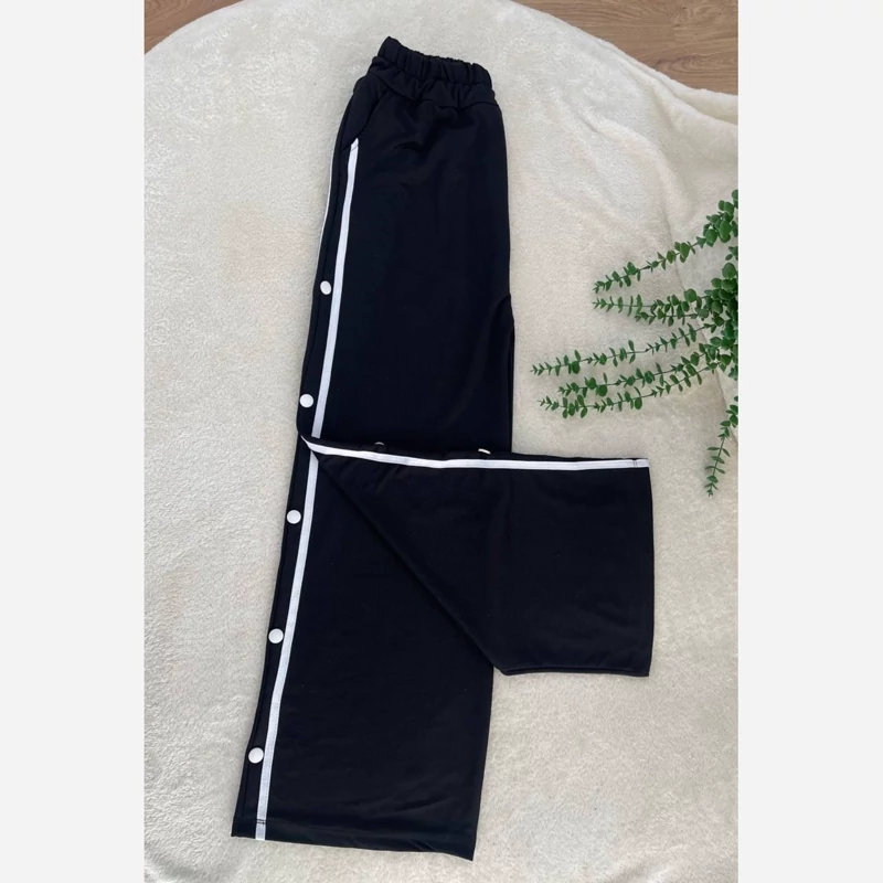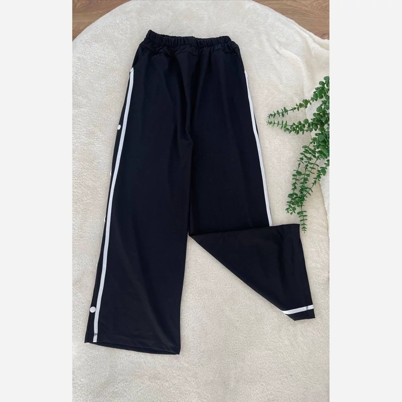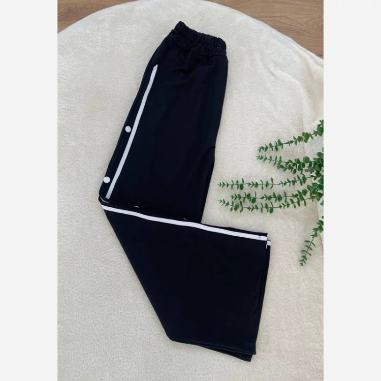 ش#86106 نام : شلوار بغل دکمه جنس : گلکسی اسپان رنگ بندی : مشکی سایز ها : فری ✅فری از 36 تا 48 قد حدود 107 کمرکشی دکمه ها کاربردی نیست.